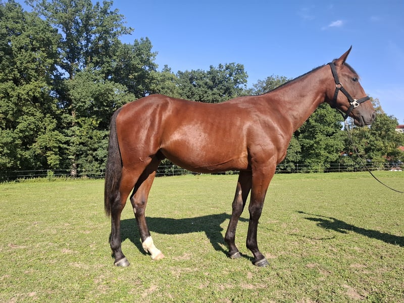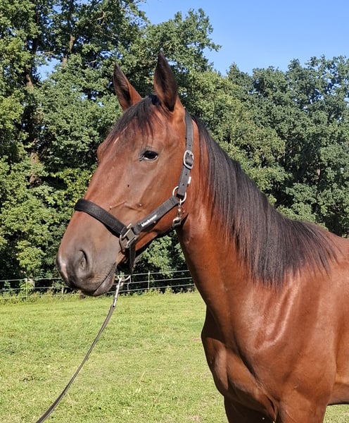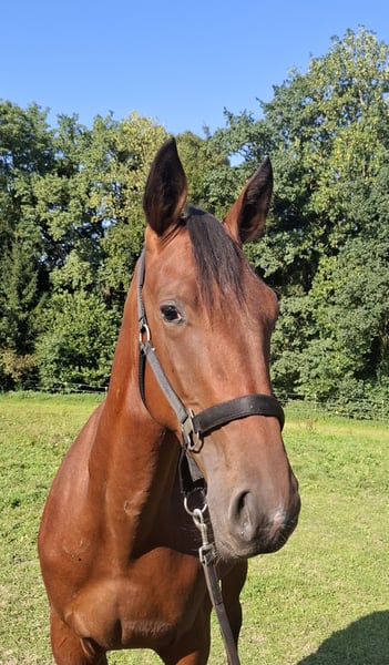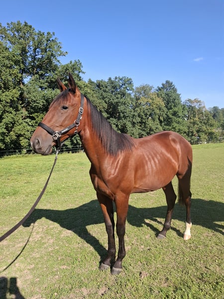 Sniper is a 1-year-old trotter stallion. This beautiful and very tall bay is only conditionally suitable for racing due to a slight misalignment in his front right leg (toe width). It would be an attempt that might fail after years, as he may not be able to maintain the action at racing speed. Nowadays, no one wants to take that risk, especially with the high costs in racing stables and the limited earning opportunities. Therefore, we are also offering him as a leisure horse, as this slight misalignment will likely never cause him problems in this area. Otherwise, Sniper is completely healthy. He was X-rayed in August and showed no findings. He is very tall and will certainly reach a height of over 165 cm when fully grown. Sniper has been with us since his birth on April 17, 2024. From birth, he has impressed with a very calm and attentive character and shows no stallion behavior. He always wants to please and is very cooperative. Sniper is familiar with leading, grooming, tying in the box, and washing his feet in the wash area or wash box. He is regularly presented to the farrier, is already wearing very light front shoes, and is fully vaccinated and dewormed. Currently, he spends the day in the paddock and has an individual box at night. In summer, the herd was also outside overnight. Sniper impresses other horses with his affectionate and cuddly nature. If you are looking to train a leisure horse yourself, you have come to the right place and can start with groundwork and other basics right away. Trotters are typically being accustomed to the cart at this stage. We hope to find for Sniper, in addition to appropriate care, a lifelong partner who enjoys training this charming horse and making him a lifelong friend. Viewings are welcome by appointment.