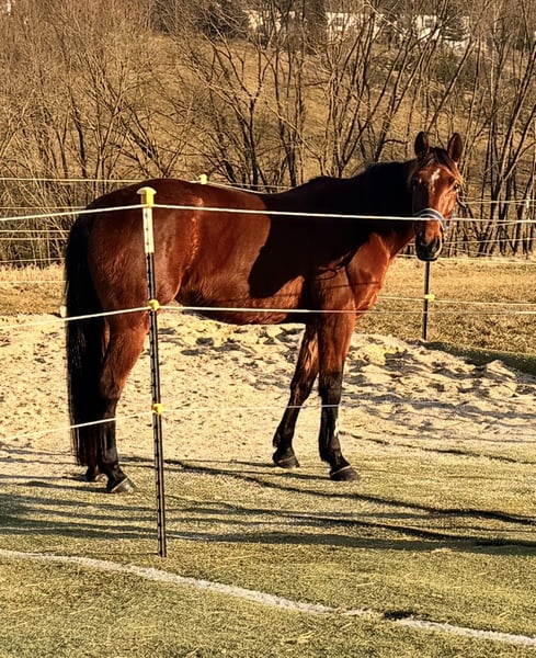 Our Giny is looking for a wonderful new home. She competed successfully in harness racing until 2024. Afterwards, she was lightly ridden in the leisure sector in the three GGA disciplines. She came to us as a companion horse to keep company for our mare and has enjoyed life on the pasture for the past six months. We are offering Giny for sale due to herd reduction. She is in excellent health, fully vaccinated, dewormed, and has an up-to-date dental check. She is barefoot. Her temperament: affectionate, sweet, and curious. My 10-year-old son has always taken care of her. She is familiar with both stable and open stall management. In the herd, she is low-ranking to middle-ranking and always friendly towards the other horses.