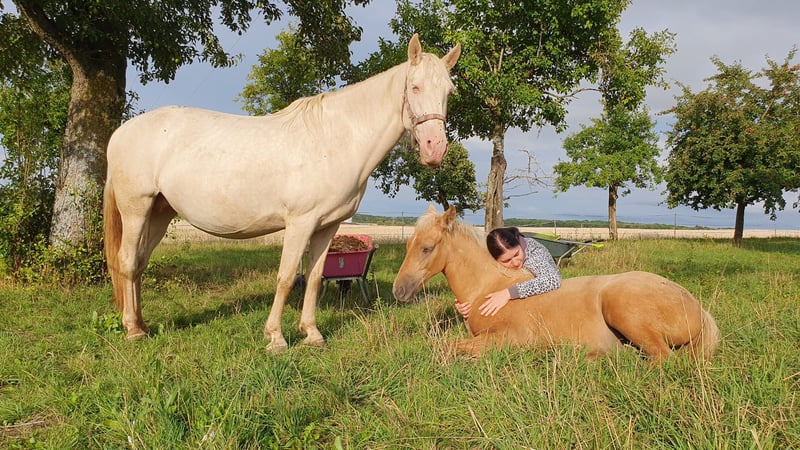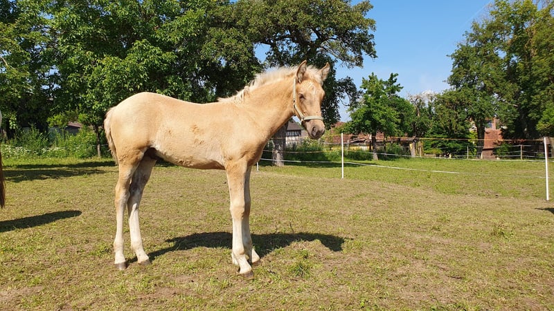 Absolute one-of-a-kind: Our unique, unusually bright Palomino Warlander colt "Inferno von Greenhorn" with papers from BZVKS and registered with the international WSS is reluctantly offered for sale to good hands after long considerations due to downsizing. Born on March 28, 2025. Inferno has been registered as a premium foal. Father: Friesian KFPS, black (rare chestnut gene carrier), 167 cm at the withers, last two pictures. Mother: PRE ANCCE, cremello (available for viewing on site), 153 cm at the withers, partially shown with Inferno in the pictures. Expected to reach approximately 160-165 cm at maturity and has a beautiful baroque type. The mother is an exceptionally comfortable ride. He also shows comfortable gaits. He has inherited a lot of mane and tail from his father, and he will likely have some feathering on his legs. Beautiful little head with pretty eyes. Arched topline. A dream of a horse! Inferno has been well-socialized, growing up in a mixed herd, living with an older gelding, a similarly aged foal, and several mares. He is accustomed to a robust lifestyle, knows box stalls, open stables, and 24-hour pasture. He is very affectionate, people-oriented, and attached. Regularly dewormed and vaccinated. Already familiar with the farrier. Well-behaved in handling (leading, tying, grooming, loading). His extremely rare color genetics for a first-generation Warlander (ggeeAaCrcr) also make him interesting for future breeding, as he can theoretically pass on all colors (buckskin, bay, perlino, palomino, chestnut, cremello, smoky black, black, smoky cream). Gray offspring are only possible if the mare is gray; he himself does not carry gray. His offspring would receive Warlander papers from the following mares: Warlander, Friesian, PRE, Lusitano, PRM, Cruzado Iberco (Lusi x PRE). There are some Friesian-Iberian (PRE/Lusitano) mixes, but the targeted and thoughtful breeding with Warlander papers is still very rare - and even rarer to find for sale, especially unique in this dreamlike special color. Worldwide, there are only 3 or 4 other Warlanders in this unusual chestnut-based Palomino color for 50% Friesian. Please only serious inquiries. We place great importance on maintaining contact even after the sale, as we would like to follow his development and career. He will soon be weaned and can move out anytime from now on. Only to an absolute 5***** home!