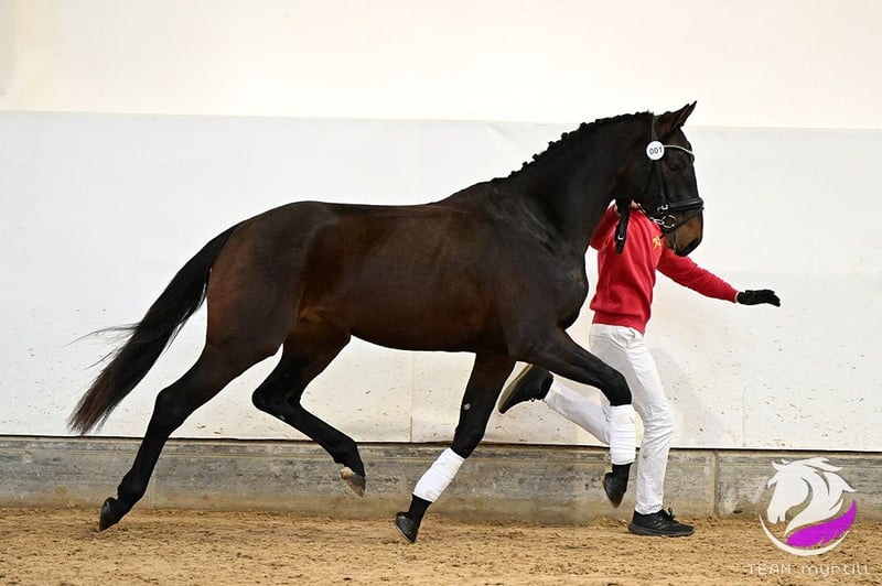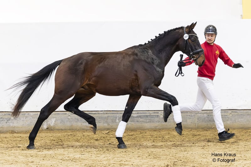 DonJonSon van de Fils è stato elogiato alla Giornata dei Giovani Stalloni per i suoi movimenti dinamici, che coprono il terreno con un'impulsione riconoscibile e una tendenza alla salita. Ha ricevuto un 8,5 sia per il trotto che per il canter! È figlio dello stallone Oldenburg premium Diamond First PrH, che ha vinto in competizioni internazionali di dressage sotto la guida di Simone Pearce. La madre Ariadne van der Fils combina le linee del leader della classifica WBFSH Glock's Johnson TN N.O.P. con il comprovato stallone da Gran Premio AWÖ Lux As. Dalla stessa linea proviene anche Crelido, da Calido, che ha avuto successo nella classe avanzata sotto la guida di Karin Pichler. Per qualsiasi domanda, contattateci telefonicamente al numero +43 664 144 90 11.