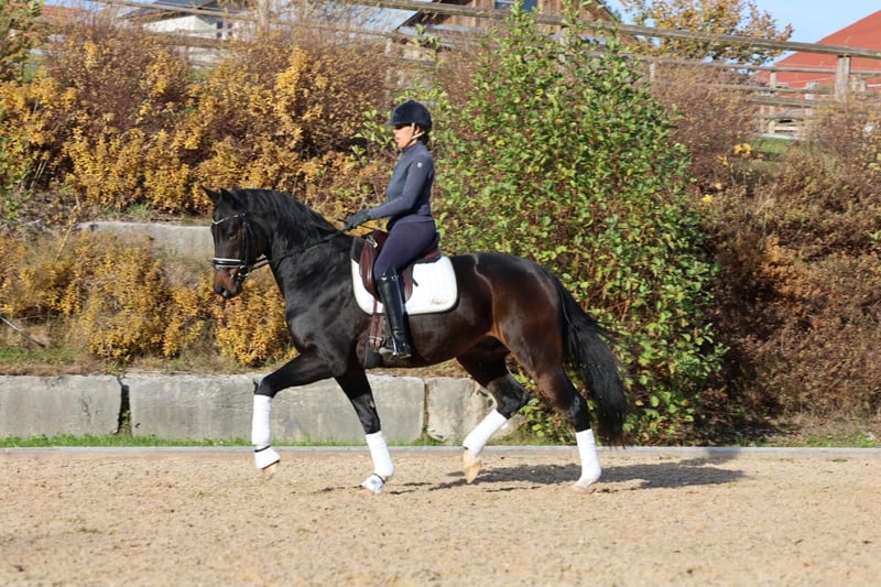 Felicio is an exceptionally charming and talented dressage horse with outstanding rhythm, suppleness, and an active hind leg. He has been in our possession since foalhood and was gently backed as a three-year-old, followed by the necessary time for further development. He now has competition experience and consistently demonstrates focus and eagerness to learn in the arena. Currently progressing towards class L, he impresses daily with his rideability, motivation, and work ethic. Highlights: 🌟 Correct basic gaits with plenty of expression 🌟 Very good hind leg and energetic impulsion 🌟 Pleasant temperament – motivated but always manageable 🌟 Healthy, regularly presented to the farrier and veterinarian Ideal for: ambitious riders seeking a horse with potential for upper-level dressage. For serious inquiries, we look forward to hearing from you and are happy to introduce Felicio personally.