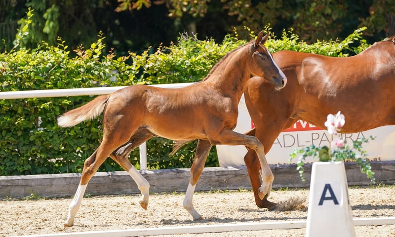 Our Skyfall - beautifully presented dark chestnut with three high white markings on his legs. Large-framed, harmoniously constructed with an elegant face, shows excellent basic gaits with a lot of thrust from the hindquarters. Knows the foal ABC, trailer, farrier, etc. From the mother, there are already successful dressage horses up to class S, and several offspring have been sold to stallion breeders.
