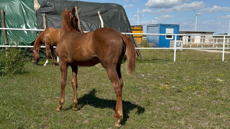 Typical filly by Poker de Mariposa x Gemini CL – Expressive young prospect with top pedigree For sale is an extremely charming and modern filly with excellent jumping lineage. Sire Poker de Mariposa, a son of the world-famous Nabab de Rêve from the motherline of Flora de Mariposa, represents exceptional talent in jumping, rideability, and a modern sport horse type. The dam's sire Gemini CL, a clone of Gem Twist, brings legendary performance genetics to this pairing. The foal presents itself as very spirited, attentive, and full of energy, always curious and people-oriented. She has an expressive conformation, with correct foundations and a good topline. Her movement is loose, lively, and powerful – with a lot of elasticity and natural balance.