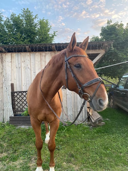 Hello, it is with a heavy heart that I need to find a new home for my gelding Nitro. He needs to be rehomed as soon as possible. He is 15 years old and 16.1 hh tall. He is well-suited for dressage riding and learns new things quickly. He also enjoys hacking, although he prefers not to go alone. He has the most fun doing free jumping exercises with small jumps. Accessories such as saddle, boots, etc., can be included for an additional fee. If interested, please feel free to contact me.