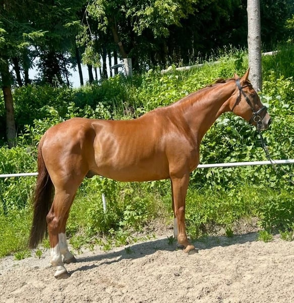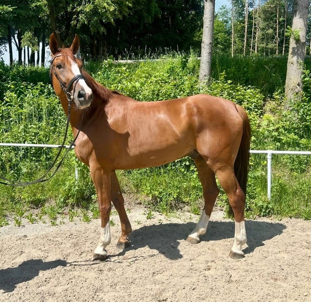 Leon is a stunning and exceptionally well-trained chestnut gelding sired by Leonardo out of Dantes and Aloube. Standing just under 1.80 meters, he is very easy to ride and has a great sense of fun. Although born in 2018 and already experienced and confident as a show jumping horse, Leon also impresses in dressage. He is very personable and approachable in handling. Leon is the perfect all-rounder. The gelding is in top condition and currently barefoot. For more information and videos, please contact me via WhatsApp or by phone at: +43 660 3632373. Location: Pelmberg 15, Upper Austria. Viewing and trial riding are available by appointment. Transport can be arranged upon request.