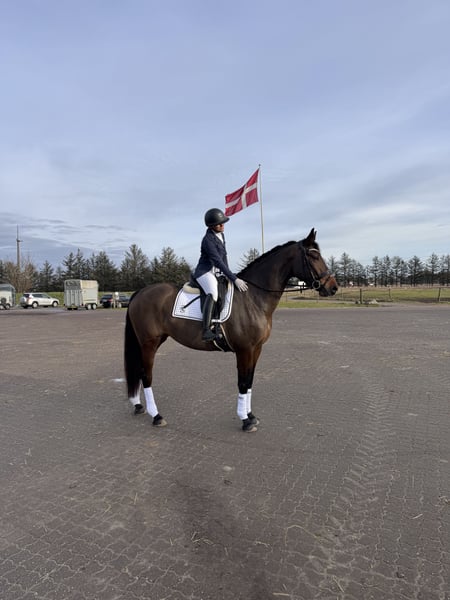 Athena is a 5-year-old Danish Warmblood mare, standing approx. 169 cm, with plenty of drive and ambition for the experienced rider who wants to go far. She is forward-thinking and athletic, able to collect, move laterally, and is quick-thinking in combinations. She approaches jumping with enthusiasm and joy. Athena is a sensitive and energetic mare who therefore requires an experienced rider — but she is never naughty. Bred with a strong focus on dressage, she also shows a natural talent and flair for jumping. She has a good eye for distances and jumps with style, despite having only been jumped under saddle 6–7 times so far. ✔ Red passport ✔ By Santos ✔ Clean X-rays ✔ Up to date with vaccinations, deworming, and farrier Athena has had a short growth and riding break but has now resumed training. She has participated in three shows mainly for experience and exposure, handling new environments with remarkable calmness and confidence. A quality young mare with exciting potential for the future.