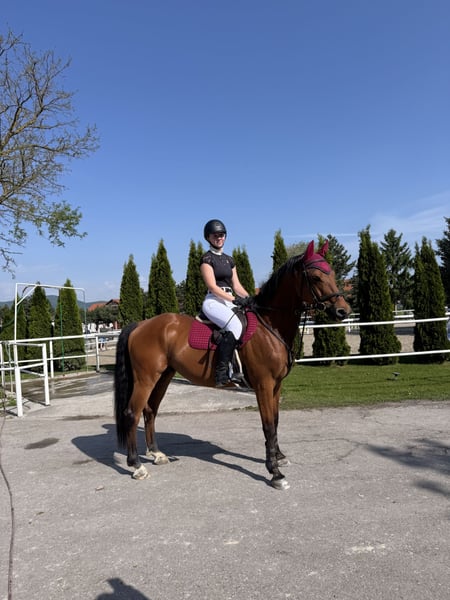 I am offering for sale a brown gelding of the Slovak Warmblood. His name is Lucas, he is 12 years old, height at the withers approx. 164cm. A horse suitable for sports for a skilled child or amateur. Jumped to 130, currently with a child 120. ✅ Regularly treated, vaccinated, dewormed, without horseshoes ✅ The horse is healthy, without bad habits ✅ Possibility to try on site Price: €15,000 Location: Šamorín 📞 Contact: Emma Roberta Vetráková | tel. number: +421 910 777 734 📸 I will send more photos or videos upon request.