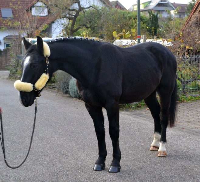 Mustang , schöner im modernen schweren Warmbluttyp stehender Rappe Wallach. Bisher wurde Mustang leicht angeritten und macht seinen Job dabei sehr anständig. Ist bewegungsfreudig und lernwillig, ideal zum weiter ausbilden. Lässt sich überall anfassen und putzen , ist Schmiede und verladefromm. Kennt Offenstall und Herdenhaltung, ist mit landwirtschaftlichen Tieren und Geräten vertraut. Auf Wunsch mit AKU von anerkannter Pferdefachklinik !