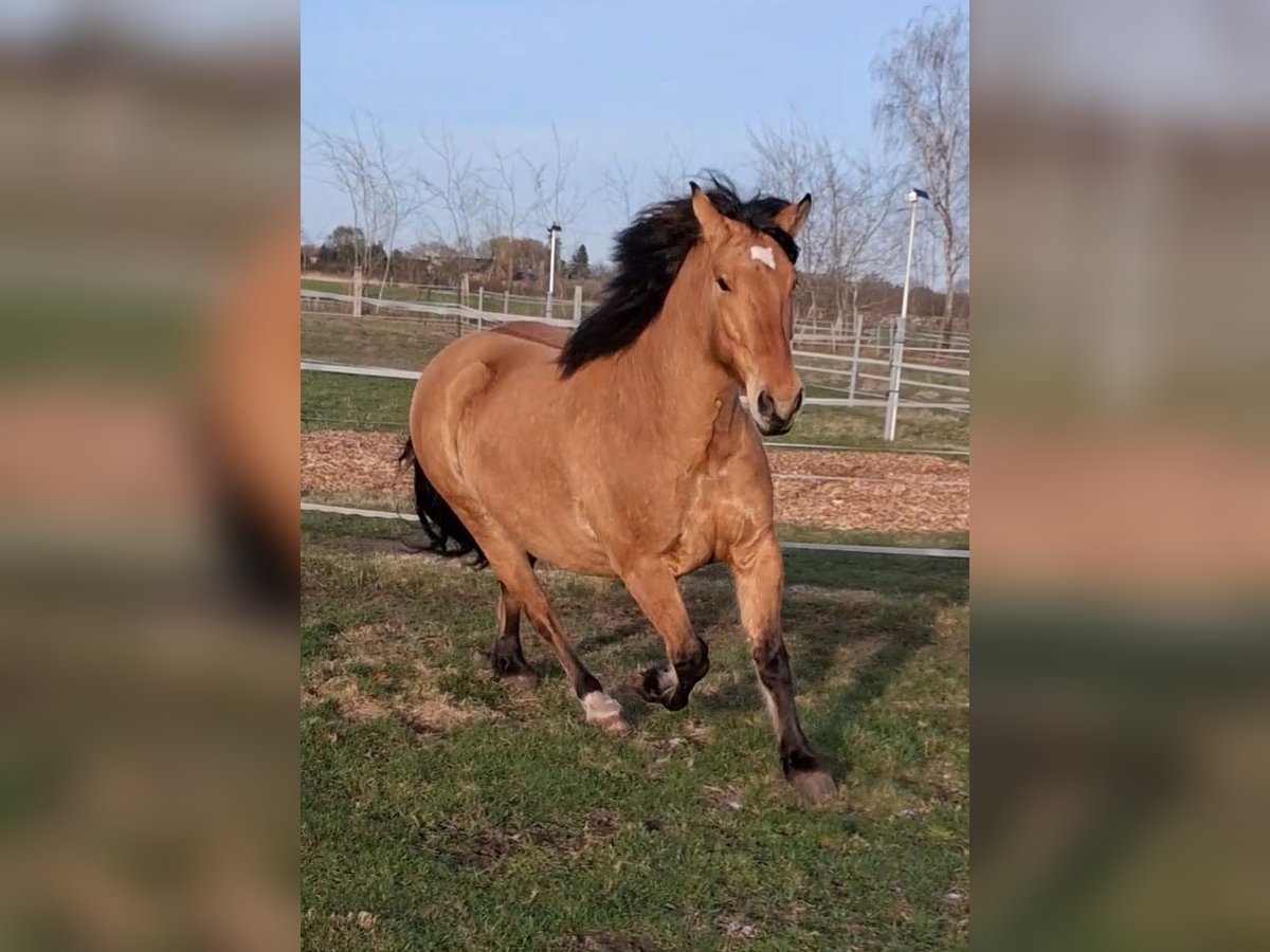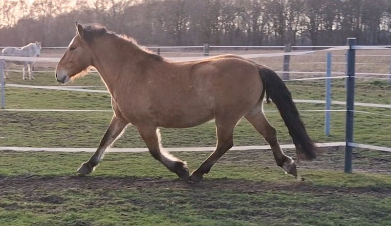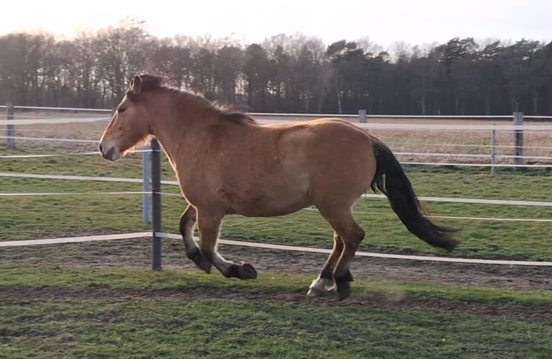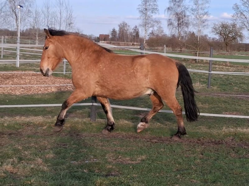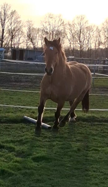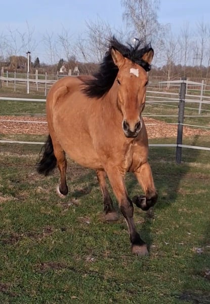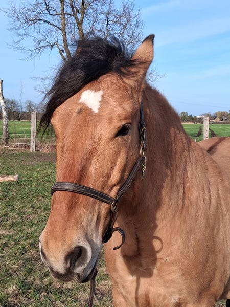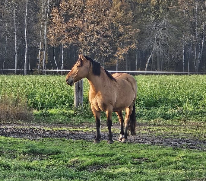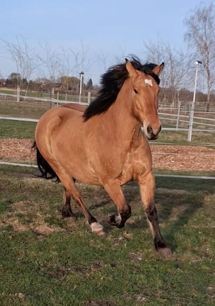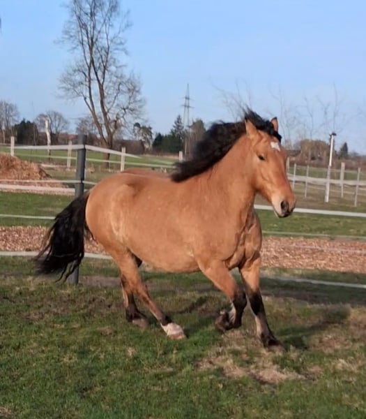 Hier steht ein besonders schicker junger Warmblut Wallach in der Farbe Falbe zum Verkauf. Cayetano ist ein sechs Jahre alter Cruzado, der nun für seine weitere Ausbildung bereit ist. Er ist ca. 1,56m groß und durch sein stabiles Fundament ein Gewichtsträger. Er ist ein Spätentwickler und er befindet sich gerade in den letzten Wachstumszügen, die Wachstumsfugen schließen sich gerade. Er kennt Reitergewicht, auch in Bewegung. Er ist vom Boden bereits bestens auf seine Zukunft als Reitpferd vorbereitet: Bodenarbeit an der Hand, Longe oder im Freien, Stangengymnastik sowie Spaziergänge im Gelände und Dorf gehören zu seinem regelmäßigen Training. Auch einige Trailhindernisse und die Pferdewippe kennt er. Neben der Horsemanshipausbildung beherrscht er bereits Schenkelweichen und Seitgänge, zudem parkt er perfekt an der Aufstiegshilfe ein. Er ist also voll trainiert, sodass der neue Besitzer hier einen Traumstart für die reiterliche Ausbildung eines tollen Pferdes hat. Der Wallach wird als „angeritten“ an einen erfahrenen Reiter, der sich in der Ausbildung von Jungpferden auskennt, verkauft. Cayetano ist eher rangniedrig und vom Charakter her ein sehr höfliches und ruhiges Pferd. Er steht super brav am Anbinder, genießt das Putzen und gibt artig die Hufe. Er lebt bei mir robust im Offenstall mit 24/7 Weide plus Heu im Sommer. Wenn du Interesse an Cayetano hast, freue ich mich über eine kurze Vorstellung des neuen Stalls und der Haltungsform, und natürlich auch von dir. Ich bitte höflichst darum von reinen Preisanfragen ohne Vorstellung oder Anfragen wie „Für den halben Preis hole ich das Pferd gleich ab“ abzusehen. Ich bin an einem guten Zuhause für Cayetano interessiert und verkaufe nicht an Händler und Menschen, wo ich den Eindruck habe, dass er es dort nicht gut haben wird. Ein Kennenlernen ist nach Absprache natürlich möglich. Der Verkauf erfolgt von Privat.