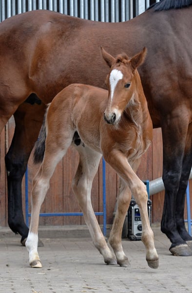 Van Helsing wurde bei uns geboren, sein Vater ist der im Landgestüt Moritzburg stationierte Valentino, seine Erfolgsliste bitten wir der Vollständigkeit halber auf der HP des Landgestütes Moritzburg nachzulesen. Seine Mutter brachte bereits 2 sehr bewegungsstarke Fohlen mit 9,5 und 8,5 in der Bewegungsnote zu Fohlenschau. Auch sie zeichnen sich durch einen freundlichen und sehr braven Charakter aus. Van Helsing selbst machte zur Fohlenschau den Pausenclown und zeigte sich für seine Verhältnisse eher unter seinem Niveau und erhielt 8,5 in der Bewegung, obwohl er über deutlich mehr Potential verfügt,das jedoch an diesem Tag nicht zeigte. Ausstrahlung und Präsenz verfügt er vom ersten Tag an und beeindruckt mit Mut,ohne Scheu nimmt er alle Aufgaben an und zeigt sich bis zum heutigen Tag überaus gehorsam. Er ist ein sehr unkompliziertes Fohlen, ist top halferführig,fürchtet sich nicht wenn er mal alleine ist und kommt mit allen Situationen mit Ruhe und Überblick seinerseits sehr gut klar. Wir sehen ihn ebenso im gehobenen Fahrsport, hier vielleicht sogar als imposanten Einspänner wie auch als tolles Reitpferd. Aufgrund des außergewöhnlichen Pedigrees seiner Mutter mit Anschluss an den englischen Vollblüter Signum xx vereint er sowohl die Vorzüge des Schweren Warmblüters wie auch die Leichtfüßigkeit, besonders in der Galoppade,des Vollblüters. Charakterlich hat er das unerschütterlich coole Temperament des Schweren Warmblutes, keine Nervigkeit und keine Spinnereien.