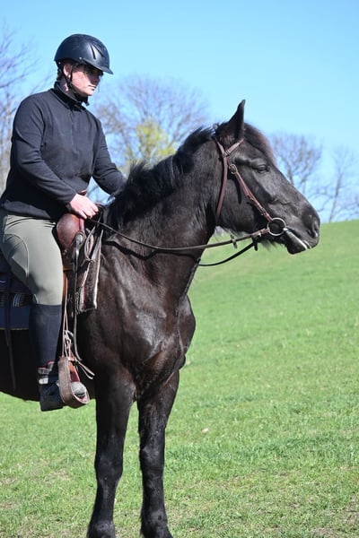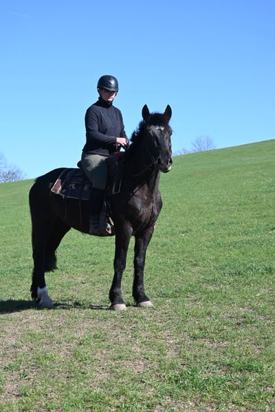 Belinda geboren am 15.05.2021 ca 1,60 m ist eine kräftige ausdrucksstarke Rappstute mit einem unglaublich feinen Gespür für ihren Menschen. Sie ist ein ganz besonders liebes und sensibles Pferd das gefallen möchte. Sie ist angeritten und gefahren und zeigt sich unter dem Sattel brav. Sie buckelt nicht und geht nicht durch. Dennoch steht sie noch am Anfang ihrer Ausbildung und ist kein Anfängerpferd. Sie braucht einen ruhigen erfahrenen Menschen der ihr Sicherheit gibt und sie liebevoll aber konsequent weiter fördert. Im Umgang ist Belinda sehr menschenbezogen aufmerksam und fein. Sie bindet sich eng und sucht die Nähe. Mit Geduld hat sie bei uns viel Vertrauen aufgebaut und entwickelt sich stetig weiter. Belinda lebt im Offenstall mit durchgehendem Zugang zu Heu was ihr sehr gut tut und beibehalten werden sollte. Abgabe nur weil wir ihr aktuell nicht die Zeit und individuelle Förderung geben können die sie verdient. Wir wünschen uns für sie ein liebevolles erfahrenes Zuhause in dem sie ankommen darf und weiter wachsen kann.