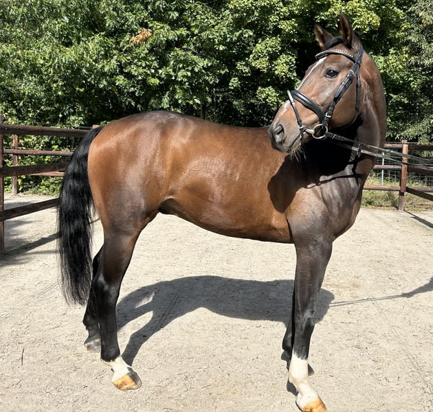 For sale is an impressive gelding, born in 2015. This charming bay horse not only impresses with his attractive appearance, but also with his remarkable dressage ability. This talented gelding impresses with his good basic gaits and balanced nature. He is the ideal partner for ambitious riders who value quality and reliability. His elegant movements and willingness to learn make him a real pleasure in the arena.