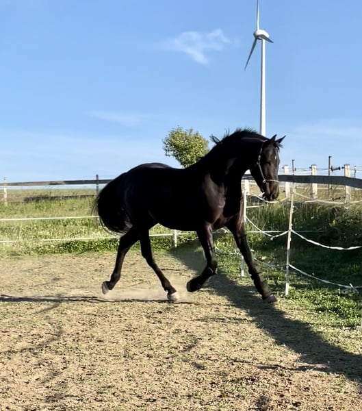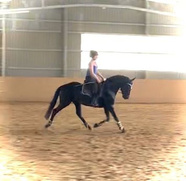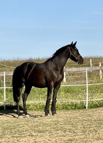 Expressive, stallion-type gelding. He will turn 10 at the end of July, is healthy and without any restrictions. He is very easy to ride and light in the hand, yet also calm and sensible when handled properly. A true "girl's horse" and suitable for riders of all levels. He is very comfortable to sit and has a pleasant temperament. Due to his very consistent and rhythmic canter, I can also easily see him competing in eventing. Additionally, he is absolutely quiet with the farrier and loads alone (he will step in on his own). Currently, he is barefoot and, for private reasons, not in training at the moment, which makes him a bit rounder ;) He shares a paddock with another gelding during the day and spends his nights in his box. He has not been shown in competitions yet due to a lack of ambition from his rider, but he is registered as a competition horse.