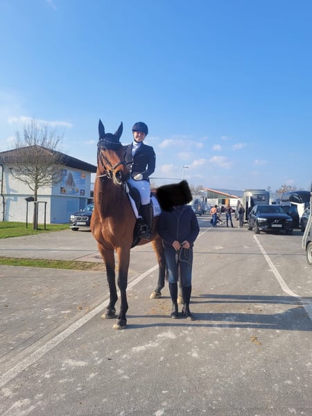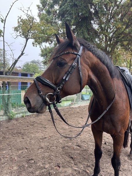 Fred Perry („Fredl“) – liebenswerter Lehrmeister & verlässlicher Sportpartner Zum Verkauf steht unser 12-jähriger Westfalen Wallach Fred Perry, Rufname Fredl. Ein absoluter Herzenswallach, der sowohl mit seinem Charakter als auch mit seiner Ausbildung überzeugt. Fredl ist bis Klasse M ausgebildet und dort platziert, zudem verfügt er über eine Vielzahl an L-Platzierungen. Im Jahr 2024 wurde er von einer Amateur-Amazone sehr erfolgreich in A und A** vorgestellt. Aufgrund von Schwangerschaft und anschließender Elternzeit wird er aktuell nicht weiter gefördert, weshalb wir für ihn nun ein passendes neues Zuhause suchen. Im täglichen Umgang ist Fredl ein echter Schatz: brav beim Verladen, beim Schmied und beim Tierarzt, sehr menschenbezogen, verschmust und stets freundlich. Er ist verträglich mit Stuten und Wallachen. Steht er gemeinsam mit einer Stute, verteidigt er diese jedoch, was im Herdenmanagement berücksichtigt werden sollte. Fredl leidet an Equinem Asthma. Ein aktueller Befund aus 2025 liegt vor. Mit konsequentem Management bringt die Diagnose keinerlei Einschränkungen im täglichen Training oder im Sport mit sich. Er benötigt bedampftes Heu oder Heulage (ein Heubedampfer kann günstig mit erworben werden) sowie eine tägliche Inhalation mit Kochsalz und kurweise Bitop Equilung. Der Flexineb-Inhalator wird mit verkauft, wodurch die Versorgung unkompliziert ist. Ein täglicher, ganztägiger Auslauf sowie eine Paddockbox oder mindestens luftige Fensterbox sind zwingend erforderlich und Voraussetzung für sein Wohlbefinden – insbesondere im Hinblick auf seine Lunge. Unter dem Sattel zeigt sich Fredl brav im Gelände, alleine mit erfahrenem Reiter oder in der Gruppe. Auch Stangenarbeit und kleine Sprünge machen ihm Freude; mit etwas Ruhe und Übersicht arbeitet er hier stets brav mit. Longieren ist problemlos möglich. Dank seiner Ausbildung, seines ehrlichen Wesens und seiner Verlässlichkeit ist Fredl ideal als Children- oder Juniorenpferd geeignet. Mit dem richtigen Lungenmanagement ist er ein absolut verlässlicher (Sport-)Partner. Platz vor Preis. Durch Lungenbefund auch unter Wert abzugeben. Fredl wird ausschließlich in beste, pferdegerechte Hände abgegeben. Komplettes Equipement kann mit erworben werden. Bei ernsthaftem Interesse freuen wir uns über eine Kontaktaufnahme.