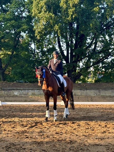 For sale is Prinz, a 12-year-old gelding who impresses with his outstanding basic gaits - his trot in particular is a real highlight. Successful up to M ** Most recently 2nd place in an M** test Confident in flying changes Currently learning series changes On the way to advanced (S) level dressage Prinz not only impresses with his rideability and willingness to learn, but also with his friendly and uncomplicated nature. ✅ Unafraid in the field - goes into the field safely alone or in a group ✅ Easy to handle - well-behaved when loading and patient at the show ✅ Socially compatible - stands in the paddock with several horses and is absolutely uncomplicated ⚠ Important: Prinz is not suitable for beginners as he wants to be encouraged and trained further. He is ideal for ambitious riders who want to progress in dressage.