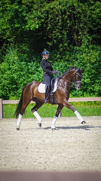 With a heavy heart, I am offering my exceptionally talented dressage horse for sale. Bredley impresses with three very good basic gaits – particularly noteworthy is his expressive, powerful trot. He always works with motivation, impressing with good rideability and a pleasant temperament. He was trained later in life. Since then, he has been in continuous development and shows himself to be extremely eager to learn, clear-minded, and physically mature. He has experience at competitions. With his balanced nature, willingness to perform, and high movement potential, he is ideally suited for talented young riders. He is also friendly, people-oriented, and uncomplicated in daily handling – a true partner with potential. The decision to sell him is not easy for me. Unfortunately, my current time constraints do not allow me to provide him with the continuous development he deserves. Therefore, I am looking for a home where he will be supported in his sport and loved at least as much as I do.