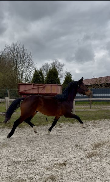 Questo castrone di 2 anni e mezzo, figlio di Valdiviani, da una fattrice di Stato con sangue di Lugato × Sir Schölling, si distingue per un passo espressivo, una base molto solida e un'altezza attuale di circa 1,68 m, con tendenza a crescere ulteriormente. La altezza definitiva è stimata tra 1,70 e 1,75 m, rendendolo adatto anche a cavalieri di stature più grande. Selezionato per il dressage, grazie al suo sangue di origine preziosa può comunque offrire molto anche per salto e cross, rendendolo versatile dal punto di vista sportivo. Nel rapporto con le persone si mostra obbediente, semplice e desideroso di imparare, conosce le basi del lavoro con i giovani cavalli ed è facile da gestire dal veterinario e dal ferratore. La sua espressività tipica e la presenza imponente lo rendono un vero colpo d'occhio, con un grande potenziale per il futuro. Oltre al suo talento sportivo, si distingue per il suo carattere amichevole: adora la vicinanza umana, cerca attivamente il contatto e si mostra molto coccolone e affettuoso. Attualmente si trova ancora sotto la cura del suo allevatore, in fase di crescita. Per ulteriori informazioni, non esitate a contattarci.