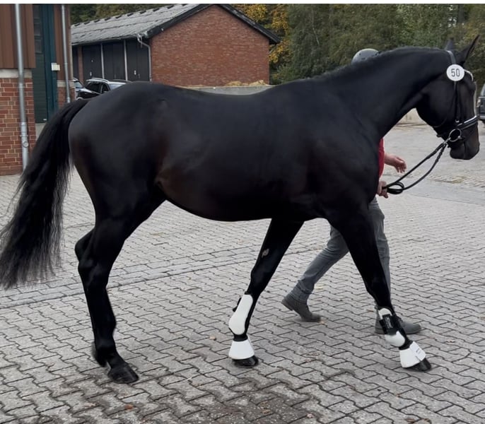 Diarado x Comme il faut: An exceptionally typey 2-year-old gelding, who impresses with his handsome exterior and his inner qualities. Highly interesting bloodlines with excellent potential for show jumping and eventing – sport-bred, eager to perform, and with that certain extra. Despite his young age, the gelding is personable, brave, and uncomplicated. He is easy to handle, lunges well, is familiar with the long rein, and knows the lungeing and free jumping exercises. He is very cooperative in daily handling. He demonstrates three above-average basic gaits: a spacious walk, an elastic trot, and a powerful, well-animated canter. His natural talent for free jumping suggests a very bright future in show jumping, while he also possesses all the qualities for a versatile career in the sport horse disciplines. The X-ray breeder's exam is without deviations, and a dental check with the removal of wolf teeth has already been performed. He is regularly dewormed and vaccinated, familiar with veterinary examinations, and used to the farrier.