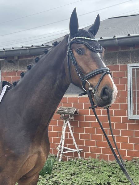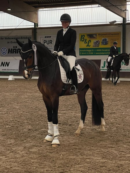 Zum Verkauf steht ein 4-jähriger Wallach mit sehr guten Anlagen für Dressur und Freizeit. Das Pferd ist gut angeritten, brav im Umgang und zeigt sich unter dem Reiter bereits sehr gehorsam in allen drei Grundgangarten. Besonders hervorzuheben ist der sehr, sehr gute, raumgreifende Schritt sowie eine tolle, große und bergauf gesprungene Galoppade mit viel Qualität und Balance. Der Trab ist altersentsprechend in Entwicklung. Der Wallach steht aktuell noch am Anfang seiner Ausbildung und befindet sich mitten in der Entwicklung. Mit weiterer, reeller Förderung bringt er beste Voraussetzungen mit, sich zu einem zuverlässigen Sport- und Freizeitpartner zu entwickeln. Ein ehrliches Nachwuchspferd mit Perspektive, das durch seine Rittigkeit, seinen Charakter und seine Grundgangarten überzeugt. Bei seinem ersten Turniereinsatz konnte er sich direkt an zweiter Stelle platzieren.