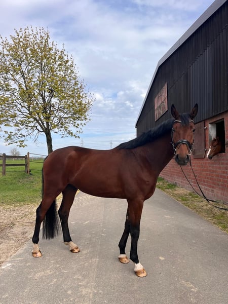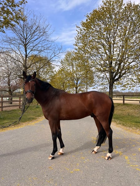 For sale: Our homebred four-year-old gelding by Vitalis out of Ehrentanz, who impresses us daily with his loyal temperament. He is fully trained for A-level dressage and has been backed by us. In handling, he is absolutely well-behaved, shows no bad habits, and convinces with his calm, balanced nature. Riding-wise, he stands out especially for his expressive, powerful canter with good cadence. He moves easily in the hand and provides a secure, pleasant riding experience – ideal for leisure riders as well as ambitious dressage riders. He is cooperative with the farrier and loading is no problem. A low-maintenance, uncomplicated horse. Videos can be sent upon request. Inquiries are welcome via phone, WhatsApp, or E-Horses (Phone: 01727453930). He can be tried out at any time.