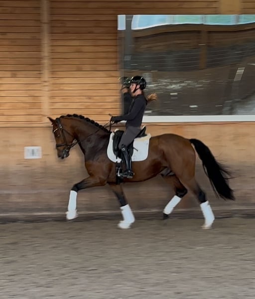 Dieser typvolle und ausdrucksstarke vierjährige Wallach von Vaderland überzeugt mit hervorragenden Grundgangarten, bester Einstellung und enormem Potenzial für den Dressursport. Er ist bereits in Reitpferdeprüfungen hoch platziert und in Dressurpferde A fertig ausgebildet. Außengalopp, Seitengänge sowie erste versammelnde Aufgaben meistert er souverän. Besonders sein bergauf gesprungener, kraftvoller Galopp und seine durchlässige, taktsichere Bewegung unterstreichen seine Qualität und Rittigkeit. Auch charakterlich lässt er keine Wünsche offen. Er zeigt sich außergewöhnlich brav, unerschrocken und verlässlich – sowohl im täglichen Training als auch im Gelände, das er problemlos allein bewältigt. Zudem ist er schmiede- und verladefromm und zeigt keine Unarten. Ein Pferd, das durch seine Kombination aus Leistungsbereitschaft, Losgelassenheit und Nervenstärke überzeugt – ideal für ambitionierte Reiter, die ein verlässliches und talentiertes Nachwuchspferd für den weiteren sportlichen Weg suchen. 📞 Bei Interesse freuen wir uns über Ihre Kontaktaufnahme. Direkt vom Züchter . Probereiten ist nach Absprache jederzeit möglich.