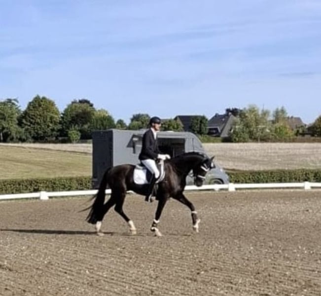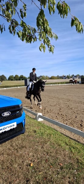 Quality, beautiful black gelding by Sir Donnerhall x Vitalis. Born in 2020, approximately 170cm tall, athletic type with a calm temperament. Multiple winner in RPF competitions. Can be ridden by children and less experienced riders, goes alone and in groups on trails, is familiar with poles and cavaletti work, jumps a small course well, good vet check including back. He would be ready for competition at Dpf A level this season (L lessons started). Due to a change in equestrian sport, he is offered with all equipment. Important: The horse windsucks and is therefore offered at this price! Sale from private owner.
