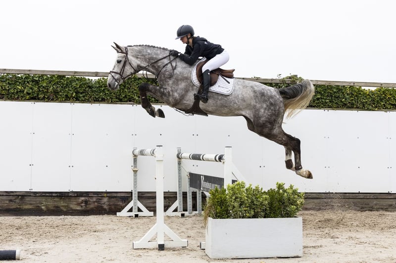 Impressive grey with enormous scope. About one year under saddle and has jumped a 1.00m course, always ridden by an amateur. Has a big canter and is easy to ride. A big, eye-catching horse. Sire El Barone 111 Z – 1.60m level. Top sire from the line of Emerald van ’t Ruytershof with offspring at the highest level. Dam Corella – no sport results. Damline Granddam Lili Marlen – 1.60m. From this line come: Qingluan – 1.40m CW Carlito – 1.35m Additionally multiple horses with international sport influence. Approved stallions: Christian – 1.60m, Cartani – 1.60m.