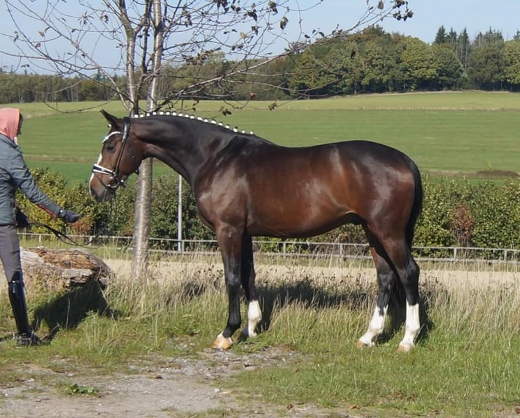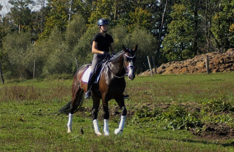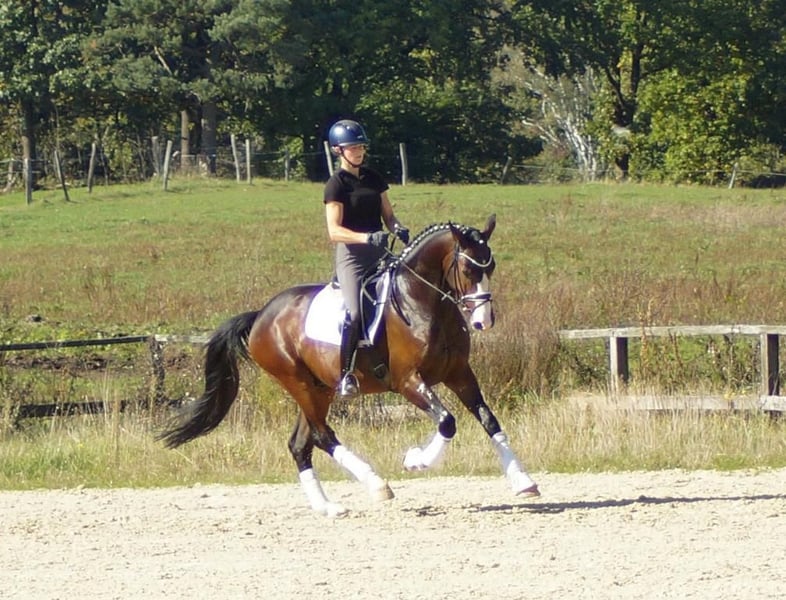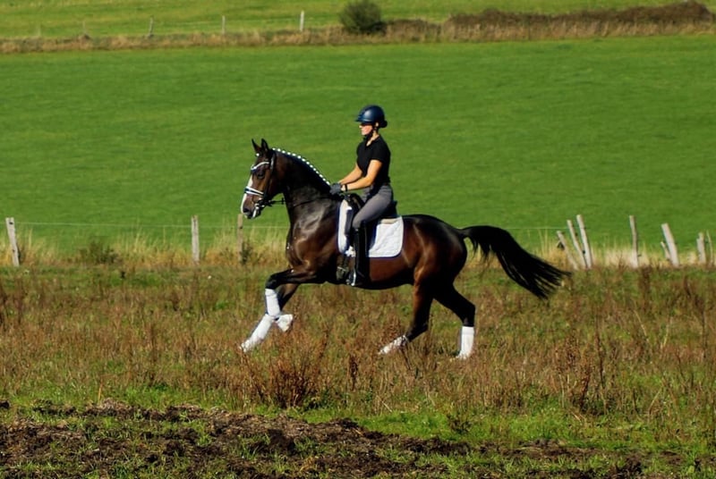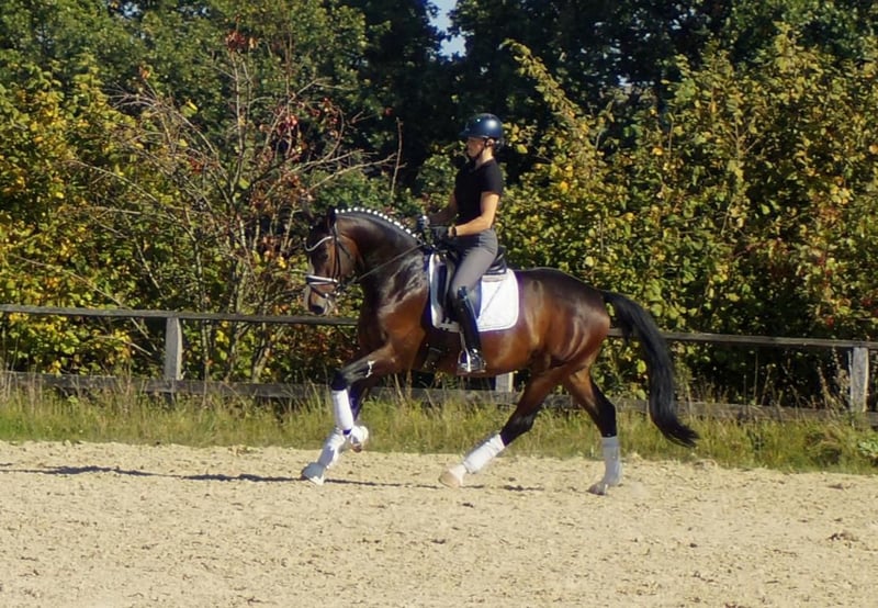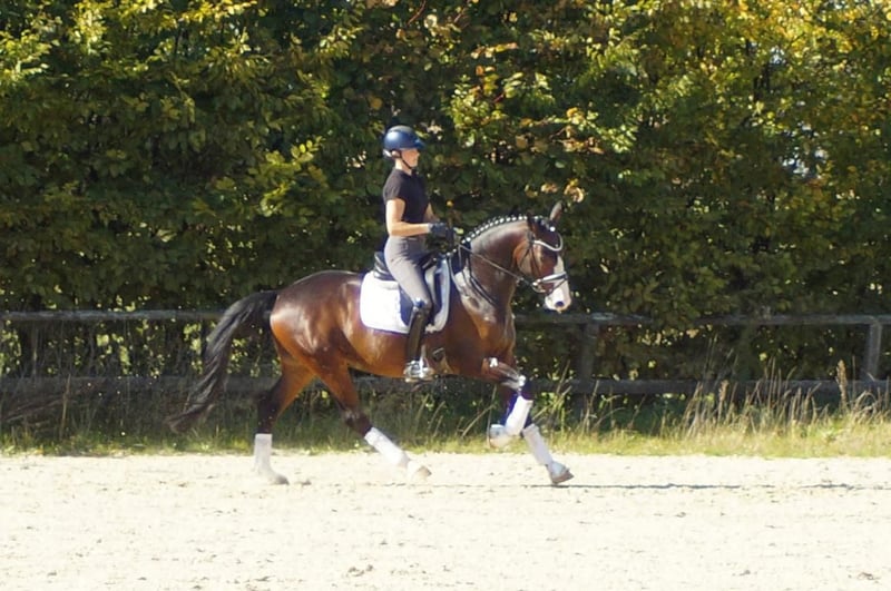 Dinero, malgré les grandes traces laissées par ses proches, n’a pas besoin d’un grand spectacle pour impressionner. Lors de sa première épreuve de dressage pour jeunes chevaux, il a remporté la victoire avec une grande assurance, répondant ainsi immédiatement à des attentes très élevées. Le gagnant de la série S, Dancier Gold, ainsi que ses trois frères et sœurs complets, également performants en classe S, prédisposent ce charmant cheval, plein de caractère, à atteindre les plus hauts niveaux. Sur le plan du tempérament, il est clairement influencé par Dancier Gold. Son attitude douce, son comportement réservé et sa constante volonté de performer sont typiques de son père et de son fils. Sa mère, la gagnante de concours de chevaux de selle, Fire and Ice, lui transmet puissance, souplesse et légèreté. En plus, il hérite de ses deux parents un excellent sens de l’équilibre et une bonne mâchoire. Dans l’ensemble, il représente le cheval de dressage parfait, qui se déplace avec aisance et sans aucune tension artificielle, comme une plume.