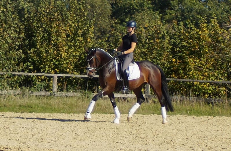 Dinero, nonostante le grandi orme dei suoi parenti, non ha bisogno di grandi spettacoli per conquistare. La sua prima prova di dressage, che ha affrontato con grande sicurezza, è stata vinta con estrema facilità, soddisfacendo immediatamente le alte aspettative. Il vincitore della serie S, Dancier Gold, da un lato, e i tre fratelli full di madre con successi nella serie S, rendono questo colorato simpatikus ideale per compiti di massimo livello. Dal punto di vista caratteriale, è chiaramente influenzato da Dancier Gold. La sua natura affettuosa, il comportamento riservato e la costante disponibilità alla prestazione sono tipici sia del padre che del figlio. Tramite sua madre, la vincitrice di concorsi di salto Fire and Ice, riceve energia, elasticità e leggerezza. Per di più, entrambi i genitori gli hanno trasmesso un’ottima sensibilità nel sedere e una buona masticazione. Nel complesso, è il perfetto cavallo da dressage, che entra con facilità e senza tensione artificiale, come una piuma.