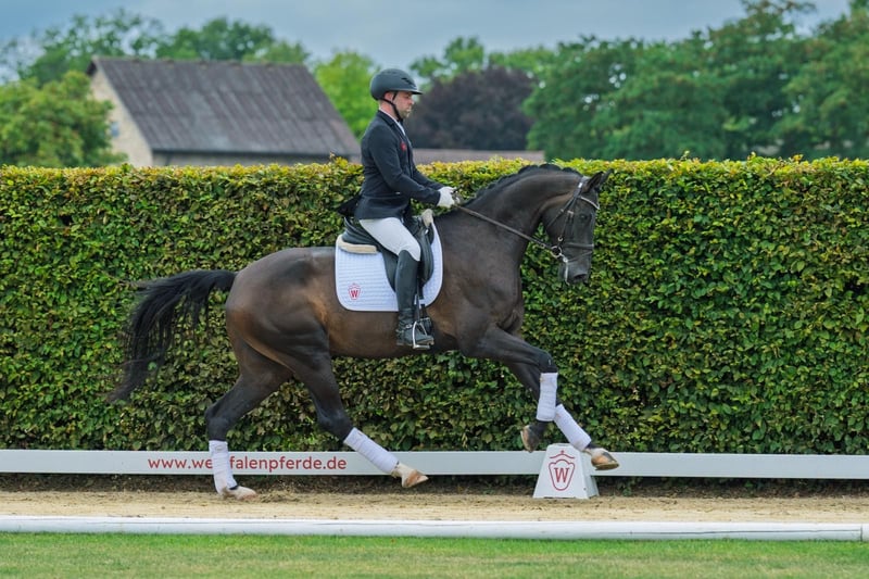El extremadamente hermoso Jo entusiasma cada día con su excelente calidad básica y su carácter encantador. Es sensible, trabajador y con muchas ganas de aprender. Se deja trabajar muy bien y seguramente podrá aprender todo. Está muy bien clasificado en las pruebas de caballos de doma de la clase A, y se muestra muy fuerte de nervios y concentrado en el torneo.
