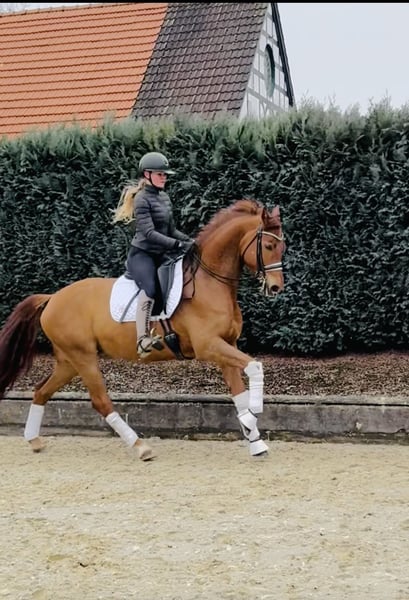 Mr. Bean is an exceptionally talented and relaxed riding horse with a strong character. In daily training, he consistently demonstrates motivation and provides an incredibly secure and smooth riding experience. In class M dressage tests, he already shows remarkable confidence at his young age of just six years. His standout feature is his expansive canter, which displays a particular talent even in collected work. The walk is also of outstanding quality, while his trot is very dynamic, elastic, and lively. What makes him truly special is his exceptional temperament! For more information about the horse, please feel free to contact us at 015731776459. We look forward to hearing from you.