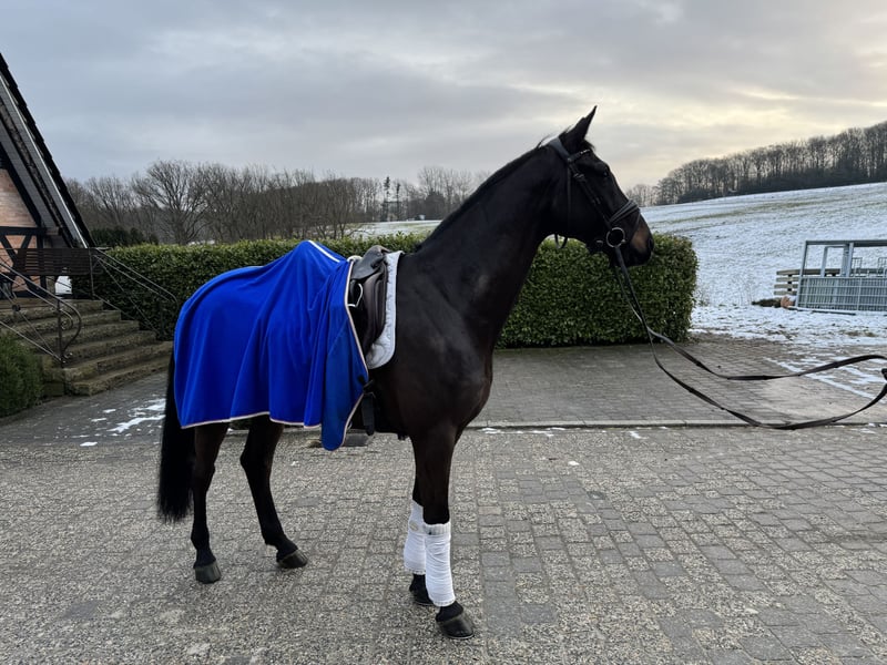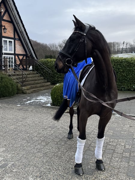 Conakry is a 7-year-old dark bay gelding by Cantona (Codex One) out of Kannan, standing at 16.1 hh. We purchased him at the end of his 4-year-old year, when he was just backed as a show jumping horse. At ages 5 and 6, he competed in Young Horse classes A and L, winning a Young Horse class A with a score of 8.6 and placing in Young Horse class L. Over the winter, he was mainly trained in dressage and is currently progressing towards M-level dressage. Conakry is a very affectionate horse by nature, extremely well-behaved in handling and under saddle. He is appropriately eager to learn and picks up new skills quickly. Unfortunately, he is somewhat timid, not about his environment but mainly around other horses and his own reflection. This is improving with patience, and he is making good progress. As a young horse, he was also somewhat fearful from above, but this has developed very positively; he now comfortably wears a sheet, and putting on and taking off jackets is no longer an issue. He has never been malicious or difficult in this regard. With continued patient work, he will develop into an excellent sport partner, whether for jumping or dressage. He possesses significant quality, three good gaits, and considerable jumping talent. He is familiar with paddock turnout, pasture (including in groups), lunging, hacking, ground work, trailer, and truck transport. X-rays were taken when he was young, showing a minor overbite at the back.