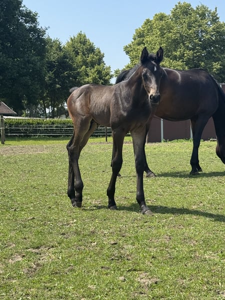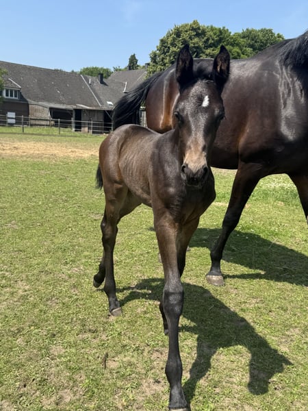 Colt foal by Iowa Gold x Maracana x Rosengold – Exquisitely bred, strong in movement This dark brown colt foal impresses not only with its excellent pedigree but also with its outstanding movement quality. Pedigree Sire: Iowa Gold – modern, sport-tested stallion with top character Dam's sire: Maracana – known for expression, uprightness, and movement dynamics From the dam line of Rosengold, a proven elite stallion with high rideability Maternal elite line The foal comes from a performance-tested, top elite mare line – the best prerequisites for sport and breeding. Movement & Type • Light-footed and elegant • Active, powerful hindquarters • Above-average basic gaits with a lot of cadence • Outstanding movement mechanics