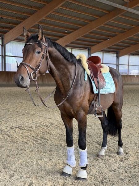 Hallo, zum Verkauf steht dieser wunderschöne, 4-jährige Hengst! Ich habe Casper bereits als Fohlen gekauft, und er ist bei mir zuhause gemeinsam mit Gleichaltrigen aufgewachsen. Vom Fohlen-ABC bis zum Beginn der Ausbildung habe ich alles selbst mit ihm gemacht. Er hat keinerlei Unarten und ist stets brav. Anhänger, Schmied, Tierarzt etc. sind für ihn selbstverständlich, und er macht alles geduldig mit. Casper liebt lange Ausritte, arbeitet aber ebenso gerne in der Halle und lernt jedes Mal begeistert dazu. Die tägliche Arbeit mit ihm macht einfach Spaß – man steigt immer mit einem Lächeln von seinem Rücken. Er wurde Anfang 2024 schonend angeritten. Da er noch Zeit zum Entwickeln und Wachsen brauchte, wurde er bisher nicht intensiv gearbeitet. Dennoch waren wir regelmäßig im Wald unterwegs, haben viel Bodenarbeit gemacht und zwischendurch immer wieder in der Halle trainiert. Dabei zeigte er sich stets aufmerksam und motiviert. Casper ist angeritten und nun bereit, über den Winter weiter ausgebildet zu werden, um im nächsten Jahr auf Turnieren durchzustarten! Aufgrund seiner Abstammung ist er doppelt veranlagt und zeigt sich auch am Sprung sehr talentiert, auch wenn dies bisher nicht weiter gefördert wurde. Durch sein überaus liebes Wesen könnte ich ihn mir auch gut im Umgang mit Kindern vorstellen. Er ist zwar noch Hengst, zeigt jedoch nur sehr wenig hengstiges Verhalten. In jeder Situation ist er problemlos händelbar – ein absoluter Schatz! Möchtest du Casper kennenlernen oder mehr über ihn erfahren? Dann melde dich gerne bei mir: 📞 01520 3314405