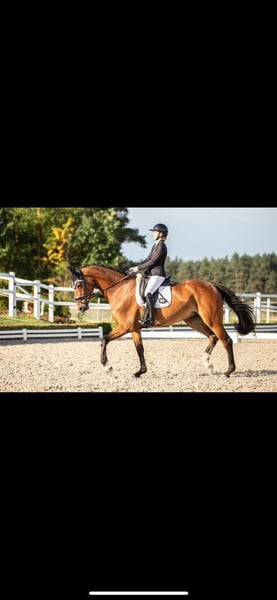 Zum Verkauf steht diese Bildschöne 10 jährige Dressurgezogene Stute (Bernay x Louis le Bon) ✨Biene✨ - brav im Gelände, egal ob alleine oder in der Gruppe - Schmiede- und Verladefromm - Anfänger tauglich - Parcours fertig (nicht weiter gefördert) - A Dressur gewonnen und platziert, L fertig (Traversalen und Wechsel begonnen) Sie wird wegen privaten Umständen verkauft, kein Notverkauf! Bei Interesse und für Videos gerne telefonisch oder per WhatsApp unter 01753586478