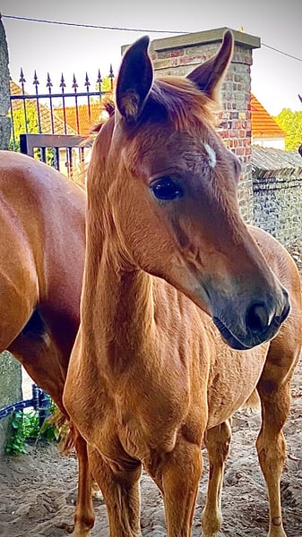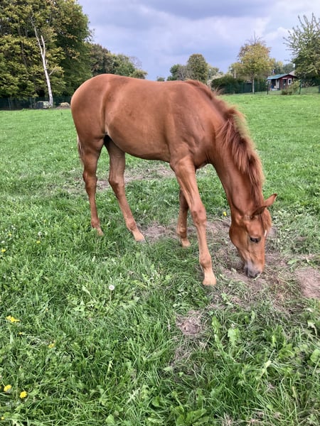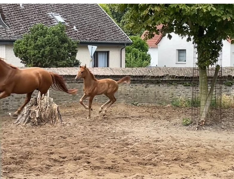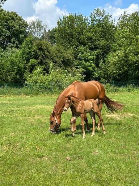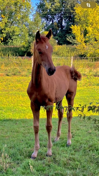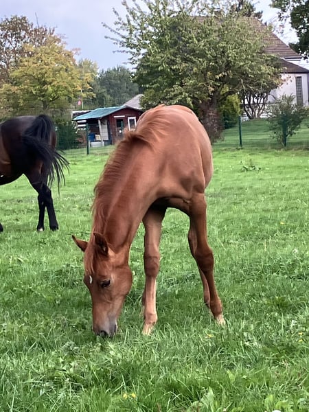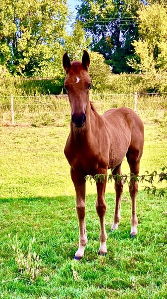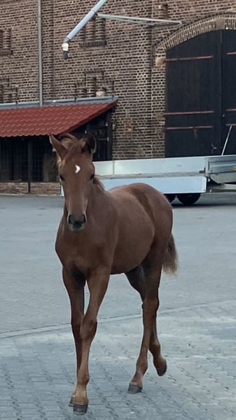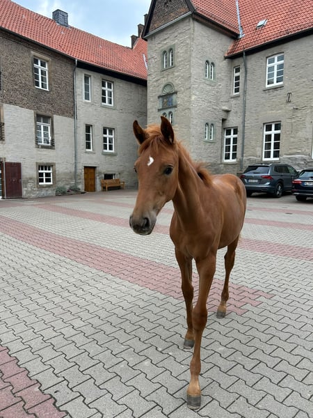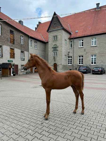 The tall young lady impresses with her charm, beauty, charisma, and loving character. Additionally, she is very athletic (despite the very dry pasture) with an excellent walk, an expansive trot, and an obvious uphill canter. Her father, Dynamic Dream, left the licensing as a champion stallion, record price holder, and is endowed with outstanding hereditary power. Many of his offspring have been auctioned for very high prices. The foal's grandmother is the full sister of the internationally successful Alive and Kicking under Charlotte Dujardin. At just nine years old, she won in the Grand Prix, Grand Prix Special, and in the freestyle. She was named as a reserve horse for the 2024 Olympics. The maternal grandfather, Vincent Maranello (Danish champion stallion by Blue Horse Zack / Future Cup / Romanov), is the sire of the well-known Zupermann in Westphalia. He is also internationally successful in the Grand Prix. https://youtube.com/shorts/sQ9gW7MkFGg?si=qgZwoAjaw2xwPFnp **Features:** - Breed: Westphalian - Gender: Mare - Year of Birth: 2025 - Color: Chestnut - Suitability: Dressage For further information or to schedule a viewing, please feel free to contact me. We look forward to your inquiry!