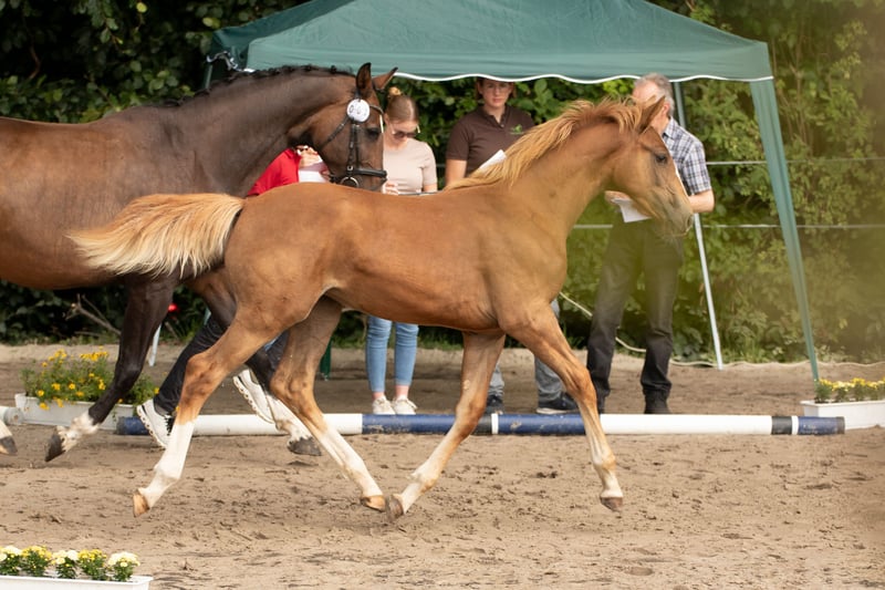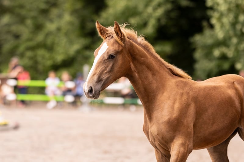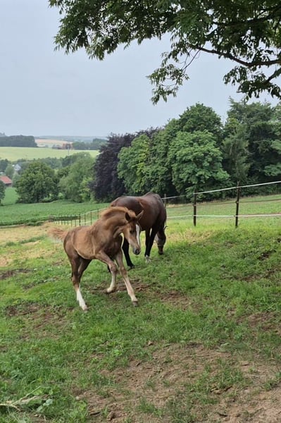 Tilda ist eine aufgeweckte sehr zutrauliche Jährlingsstute. Sie ist bei uns geboren und artgerecht in einer gemischten Herde aufgewachsen. Farblich hat sie sich interessant entwickelt. Sie könnte zum Dunkelfuchs werden. Die blonde Mähne und Schweif sind definitiv jetzt schon ein Hingucker. Sie steht auf einem sehr guten Fundament und ist auch ansonsten absolut korrekt im Körperbau. Sie ist sportlich, kompakt und sehr gut bemuskelt. Tilda hat solide Grundgangarten. Ihre Passion wird sie aufgrund der Abtammung (Tobaro x Zambesi × Grannus) im Springsport oder aufgrund ihrer tollen Art auch als gehobenes Freizeitpferd finden. Das Fohlen ABC kennt sie, ebenso das Anhängerfahren (bisher noch nicht allein). Den Hufschmied hat sie regelmäßig besucht und war auch dabei sehr brav. Sie ist kerngesund, regelmäßig entwurmt und Tetanus geimpft. Tilda wird aufgrund der Aufgabe der Pferdezucht und des Pferdesports in verantwortungsbewusste Hände abgeben. Sie kann gerne bis zum Beginn der Weidesaison bei uns bleiben! Ernstgemeinte Anfragen bitte mit Angabe einer Telefonnummer.