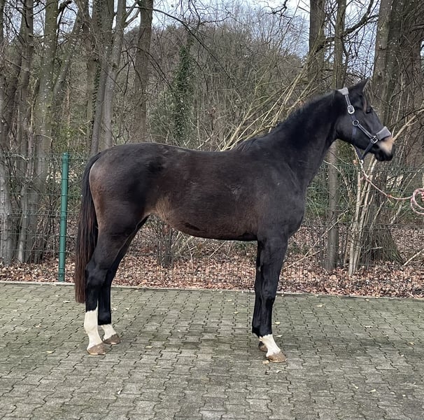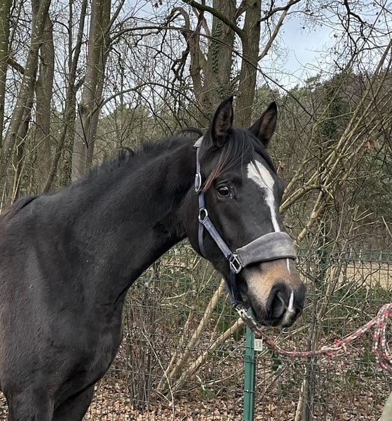 Traumhaft schöne ansprechende bald 3-jährige dunkelbraune Stute von Escolar x Goldberg mit drei besseren GGA ausgestattet. 1,68m groß, wurde vor kurzem mit den anderen jungen Pferden von der Weide in Stall reineholt. Ist schon super lieb und umgänglich.