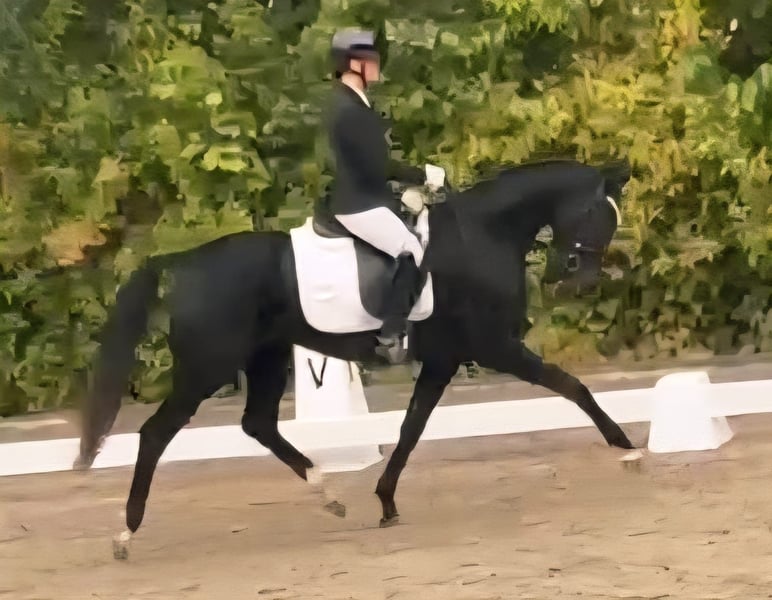 Die hübsche Bea stammt aus unserer eigenen Zucht! Bis zum Tag des Anreitens stand Bea ganzjährig drausen und konnte ihre Jugend in vollen Zügen genießen. Sie ist eine bildschöne Rappstute und bringt alles mit, was man für das große Viereck benötigt. Schon bei ihrem ersten öffentlichen Auftritt konnte sie direkt überzeugen und wurde 4. in einer Reitpferdeprüfung. Sowohl Verladen als auch der tägliche Umgang sowie putzen oder abspritzen meistert Bea problemlos. Ausgiebige Schmuseeinheiten geniest Bea auch sehr. Sie stammt aus einem hocherfolgreichen Mutterstamm. Die Mutter sowie weitere Geschwister stehen am Hof und können besichtigt werden. Bea verfügt über drei sehr gute GGA, angeritten, Röntgenbilder liegen vor, inkl Rücken und Hals, laut Tierarzt o.b.B. Sie hat einen kleinsten Chip, der laut Tierarzt keine Probleme machen sollte aber leicht zu entfernen wäre.
