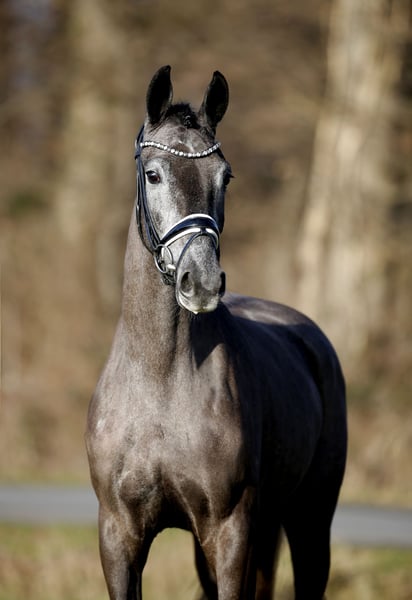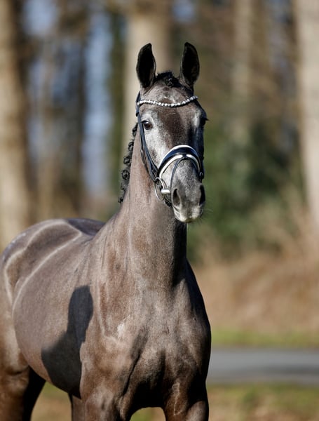 Traumhafte Rappschimmelstute mit dem Prädikat: Wertvoll!! Eine noch sehr junge , hochintelligente Dressurpüppi, die sich bereits mit nur sehr geringer Arbeit bestens präsentiert und auf Anhieb weiss, was Ihre Menschen möchten. Naturgegebene, ungezwungene Rittigkeit bei hervorragender Bewegungsqualität und bespielloser Konzentration nebst Lernfähigkeit. Eine ganz besondere, hochwertige Pferdepersönlichkeit für den begeisterten Liebhaber und Förderer. Noch voll in der Entwicklung stehendes Damenpferd aus pferdegerechter, grundsolider Aufzucht. Gute Röntgenbilder vorhanden.Auf Wunsch gerne zum Versand.