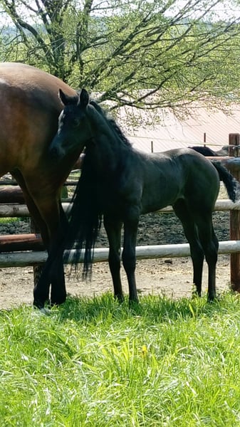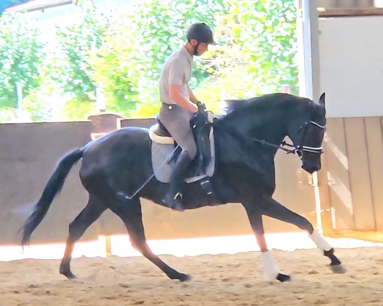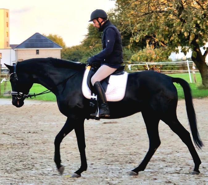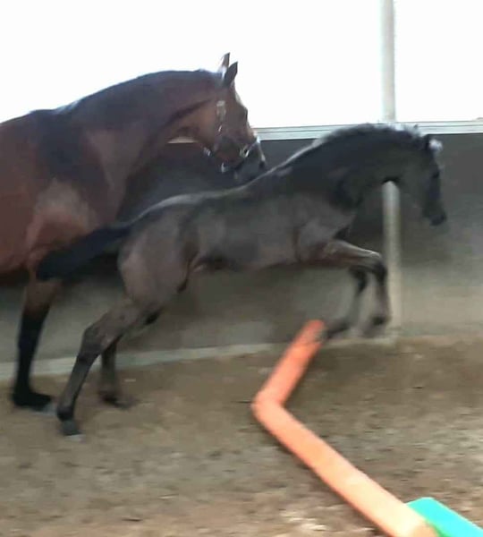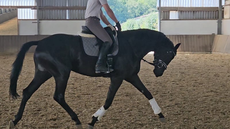 We are offering a beautiful black mare by Selectric. She has enormous movement and is a horse with potential for high-level sport. A mare through and through, she tests and needs a calm, consistent hand. Not suitable for beginners. Raised with love. Due to a finding, she is being sold well below value (more details upon request). Currently, she is turned out with a 4-year-old gelding and is being developed and lightly worked. She should be placed in nurturing, good hands.