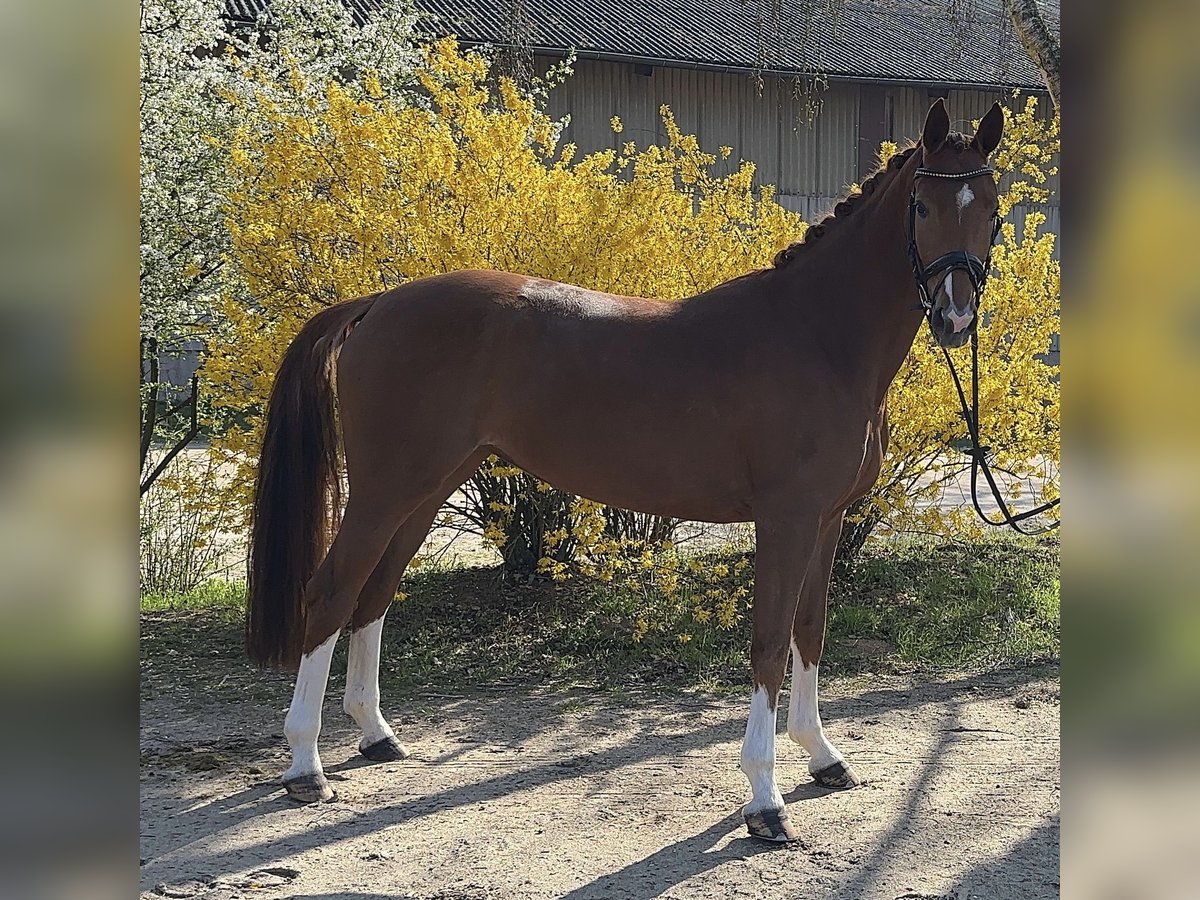 Elegant Westphalian mare, born in 2020, with an attractive chestnut coat, impresses with her graceful appearance and balanced temperament. Standing at 16.1 hh, she offers the perfect size for ambitious dressage riders who value quality and willingness to perform. This well-ridden and talented mare already shows promising potential in dressage and has a solid basic training. She is friendly in handling, eager to learn, and possesses a pleasant character, making her suitable for both competition advancement and leisure riding. Her elegant presence, combined with her good fundamental qualities, makes her a promising partner for dedicated riders seeking a reliable dressage partner. A horse that deserves attentive development and holds great potential for the future.