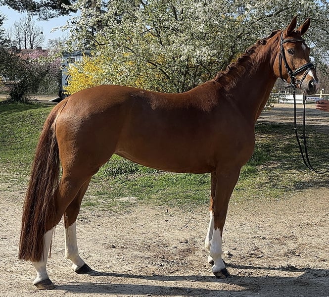 Elegant Westphalian mare, born in 2020, with an attractive chestnut coat, impresses with her graceful appearance and balanced temperament. Standing at 16.1 hh, she offers the perfect size for ambitious dressage riders who value quality and willingness to perform. This well-ridden and talented mare already shows promising potential in dressage and has a solid basic training. She is friendly in handling, eager to learn, and possesses a pleasant character, making her suitable for both competition advancement and leisure riding. Her elegant presence, combined with her good fundamental qualities, makes her a promising partner for dedicated riders seeking a reliable dressage partner. A horse that deserves attentive development and holds great potential for the future.