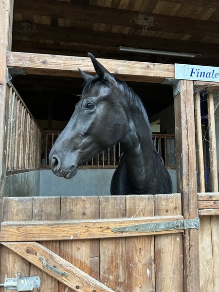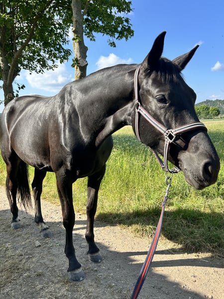 Estoy buscando un nuevo hogar para mi yegua Quintana, de 5 años. La compré como una promesa para el futuro, ya que actualmente solo tengo un pony y quería algo más joven y también un poco más grande. Sin embargo, he tenido que darme cuenta de que simplemente no somos compatibles (es mi primera yegua joven y necesita a alguien con más experiencia). Debido a su linaje, también puedo imaginarla muy bien en la cría. Ella ya sufrió una lesión, pero se ha recuperado completamente y no le afecta en nada. Se lleva muy bien con nuestro grupo de “retratados” (cuatro caballos castrados y dos yeguas). Además, está herrada y no muestra miedo a tractores, perros, etc. Quedo a disposición para cualquier consulta.