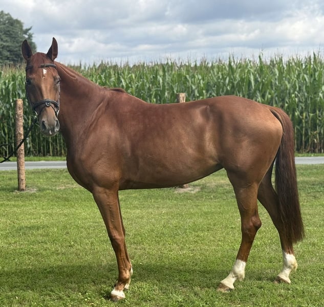 A 1.70 m, 6-year-old chestnut mare by Santo Domingo x Benetton Dream x Rohdiamant is available for sale. Saphira (as we call her) is a gentle mare with excellent rideability, very easy to ride, with good basic gaits, a natural forward movement, and a solid jumping technique with a well-controlled canter to the jump. She has been carefully trained by an amateur rider and has not yet been shown in competitions, as there were no ambitions in that direction. We are looking for a home where she will continue to be thoughtfully and lovingly supported. She is a horse that can bring joy in dressage, jumping, or even trail riding. An all-rounder with whom there is much to learn and from whom one can enjoy many shared experiences. She is being sold solely for private and health reasons of her owner. Good older X-rays are available. Saphira is familiar with dogs, cats, goats, pigs, tractors, and all other farm noises and equipment. She is herd-compatible, accustomed to daily turnout and lunging (weather permitting). Her character is affectionate, friendly, and people-oriented. She demonstrates a good work ethic. Over fences, she is honest, with good awareness and caution. She reliably completes small courses. She is a horse that wants to do everything correctly and to please in daily work. Due to her pedigree, solid foundation, attitude, character, and rideability, she could also become an interesting broodmare later on. A trial ride is possible at any time.