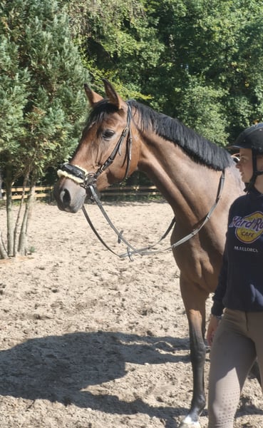 This pretty 7-year-old mare with an appealing exterior is looking for a loving, experienced home. Unfortunately, she has not had good experiences in the past and therefore needs people who approach her with calmness, patience, and a lot of heart. Amanda has been gently re-backed with us and shows herself to be well-behaved and cooperative under the rider. She goes out on trails nicely and can be ridden bitless without any issues – whether with a happy mouth or sidepull. Currently, she has significant difficulties with a bit, so a sensitive, experienced rider is needed who can give her time and trust. Alternatively, she can simply be left alone with it. In terms of character, she is a very sweet, cuddly girl who seeks closeness to humans. In handling, she is generally uncomplicated and gets along well with other horses. Currently, she is in a box with daily paddock access, but she would also feel comfortable in a pasture shelter. Due to a mild ataxia (shivering) and her poor previous experiences, we want to place her exclusively in responsible hands as a leisure horse, where she can find her place without pressure. Due to her lineage, she could also be interesting as a breeding mare. We are looking for people who enjoy giving a horse with a past a fair chance and who have the patience to build trust step by step together.