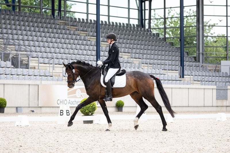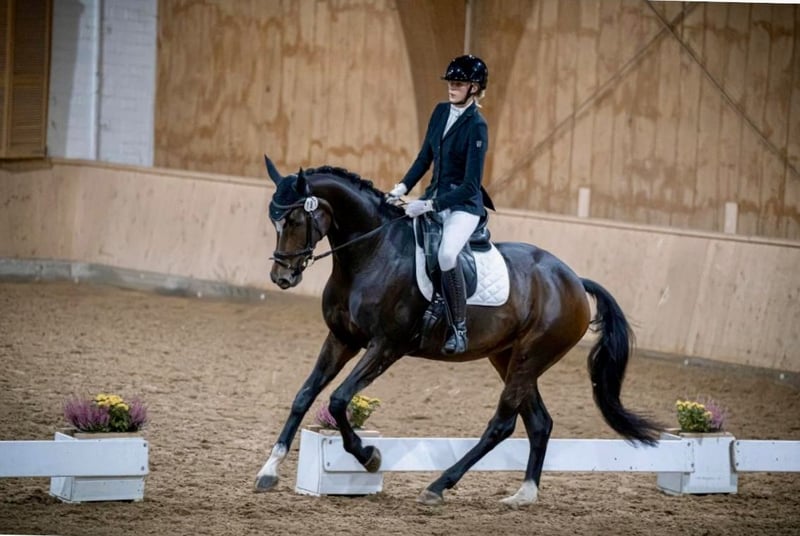 Schweren Herzens suche ich für meine Stute (geb. 2018), ca. 1,75 m groß, schwarzbraun, ein neues Zuhause. Sie ist Dressur gezogen, hat aber auch im Springen viel Talent und Spaß! Sie ist Brav im Umgang, beim Schmied und beim Verladen (auch alleine kein Problem). Kennt ein paar Zirkuslektionen. • Dressur: Siegreich in A-Dressur mit 7,5, beherrscht Lektionen auf L-Niveau. Erste Wechsel springt sie bereits auch, Traversalen begonnen. • Springen: Mit Wertnote 8,4 im A-Springen drittplatziert. • Gelände: Erste Geländesprünge problemlos gemeistert. Sie hat eine enorme Bewegungsqualität und braucht daher einen versierten Reiter, der qualitätsvolle Bewegungen reiterlich verarbeiten kann. Sie möchte grundsätzlich alles richtig machen, aber man stößt schnell an seine Grenzen, wenn man das Potenzial nicht händeln kann. Sie zeigt sich unter erfahrenen Reitern immer bemüht und lernt sehr schnell. Für Anfänger ist sie allerdings nicht geeignet, deshalb bitte von entsprechenden Anfragen absehen. Gesucht wird ein technisch versierter Reiter auf mindestens M-Niveau um sie entsprechend fördern zu können. Kleine Befunde liegen vor und wird daher weit unter Wert abgegeben. Mit guten Management steht einer Sportkarriere nichts im Weg. Ich verkaufe sie, da es zwischen uns reiterlich leider nicht vollumfänglich passt. Details hierzu gerne in einem persönlichen Telefonat.