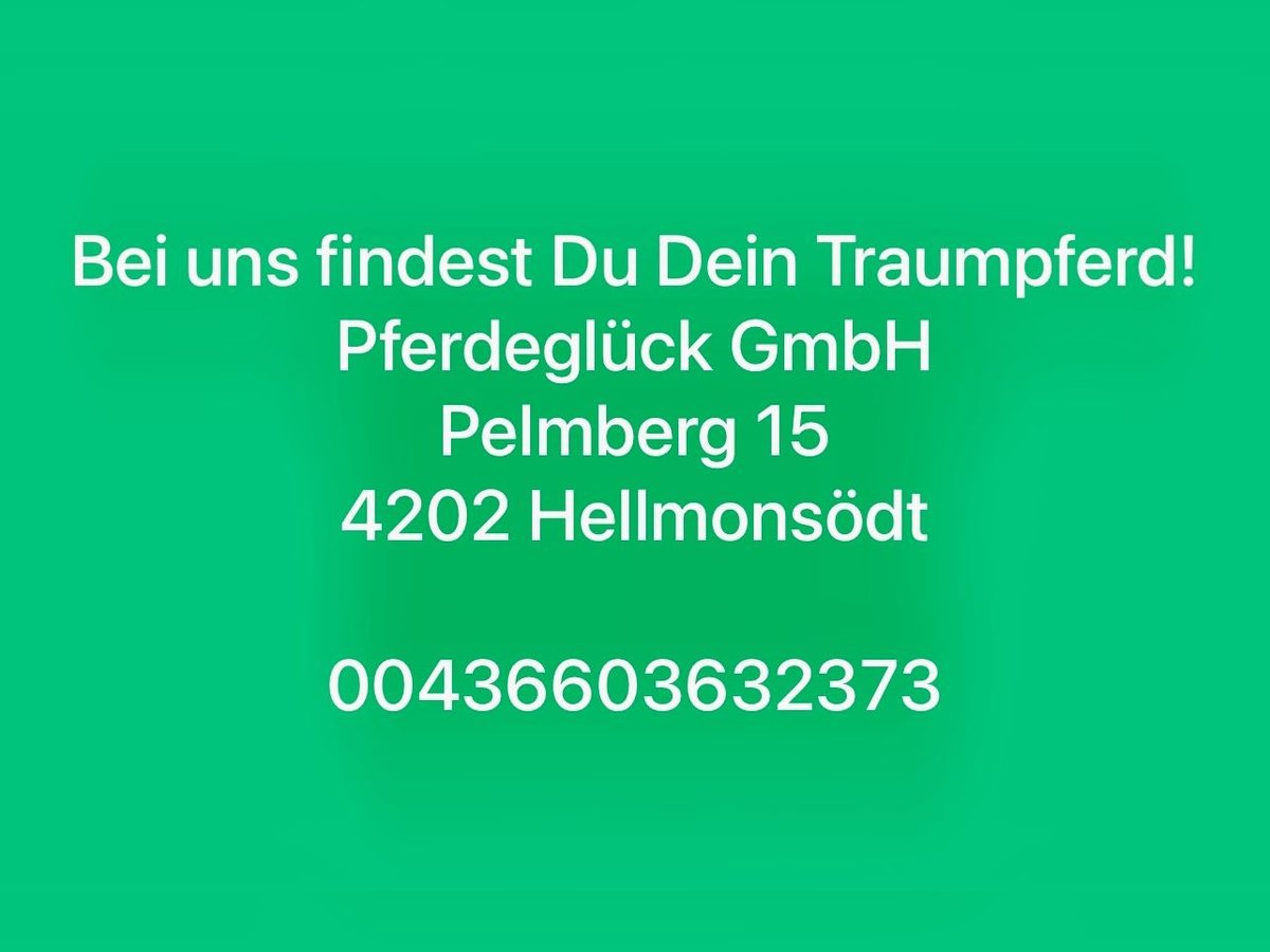 Siamo il vostro partner affidabile quando si tratta di acquistare un cavallo! I vostri vantaggi con noi: - disponibilità telefonica tutti i giorni dalle 7.00 alle 22.00. - Possibilità di effettuare allenamenti di prova tutti i giorni dalle 9 alle 20 - Una costante varietà di cavalli diversi - due arene coperte per le cavalcate di prova, indipendentemente dalle condizioni atmosferiche - Consulenza e assistenza di alto livello - Organizzazione dell'AKU - Trasporto del cavallo a destinazione - e molto altro ancora Siamo anche sempre alla ricerca di cavalli da diporto ben educati per i nostri clienti! ♥️ Requisiti: Sano Facile da cavalcare 150 - 175 cm Tutte le razze Nessuna cattiva abitudine Possibilità di prendere in braccio il cavallo! Pferdeglück GmbH Pelmberg 15 4202 Hellmonsödt Si prega di inviare informazioni su WhatsApp: 00436603632373