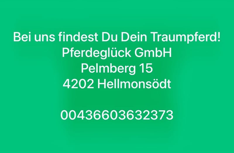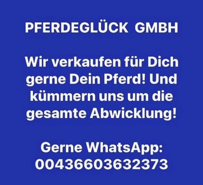 We are your reliable partner when it comes to buying a horse! Your advantages with us: - telephone availability daily from 7 a.m. - 10 p.m. - Possibility of test riding daily from 9 am - 8 pm - Constantly a variety of different horses - two indoor riding arenas, regardless of the weather - Top advice and support - Organization of the AKU - Transportation of the horse to the destination - and much more We are also always on the lookout for well-behaved leisure horses for our customers! ♥️ Requirements: Healthy Easy to ride 150 - 175 cm All breeds No bad habits Pick up of the horse possible! Pferdeglück GmbH Pelmberg 15 4202 Hellmonsödt Please send information on WhatsApp: 00436603632373