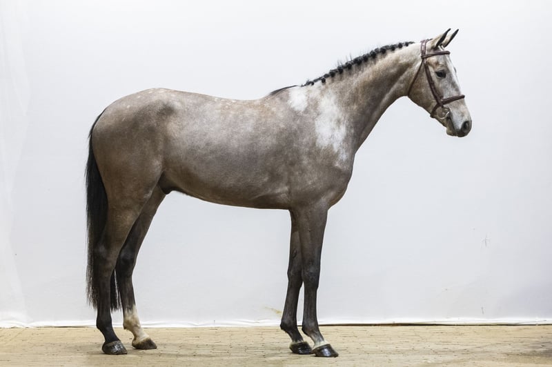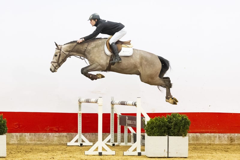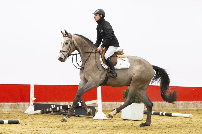 Under saddle for only one month. He accepts the work well and is rideable. Jumps a bigger fence easily, very light-footed and quick off the ground. Shows natural quality and already a good jumping style. He still needs further education and is not yet an immediate amateur horse, as he remains very green. In character he is honest, but still finds his surroundings a bit exciting. Over the fence he shows understanding and quality. A young horse with clear potential that needs steady development.